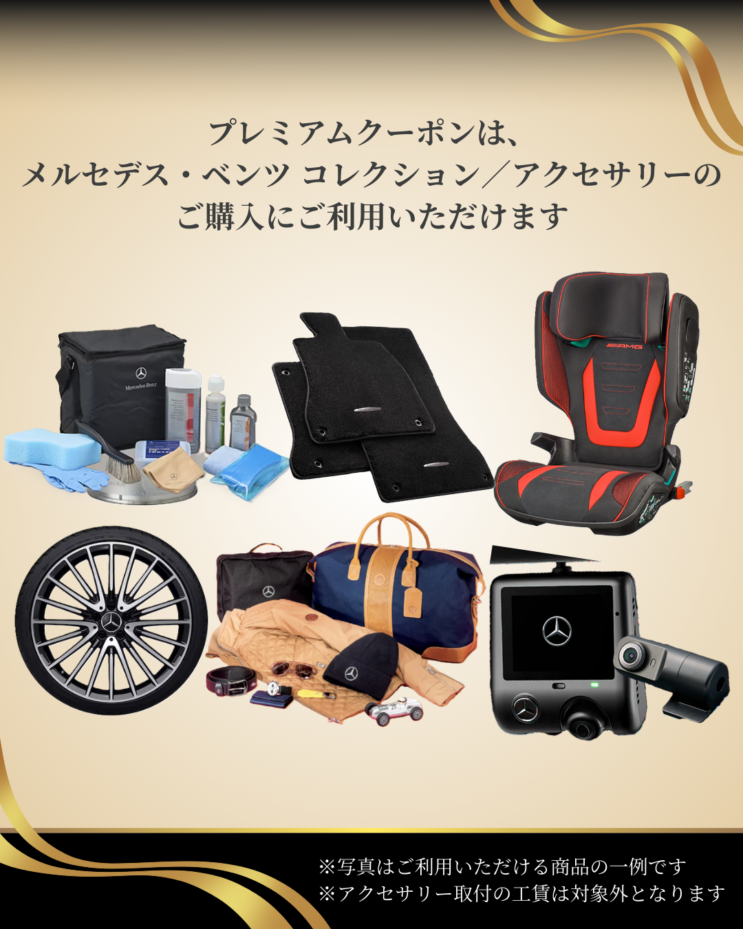 ・プレミアムクーポンは、メルセデス・ベンツ純正 アクセサリー/コレクションのみにご利用いただけます。また、クーポンのご利用は選択された販売店に限らせていただきます。